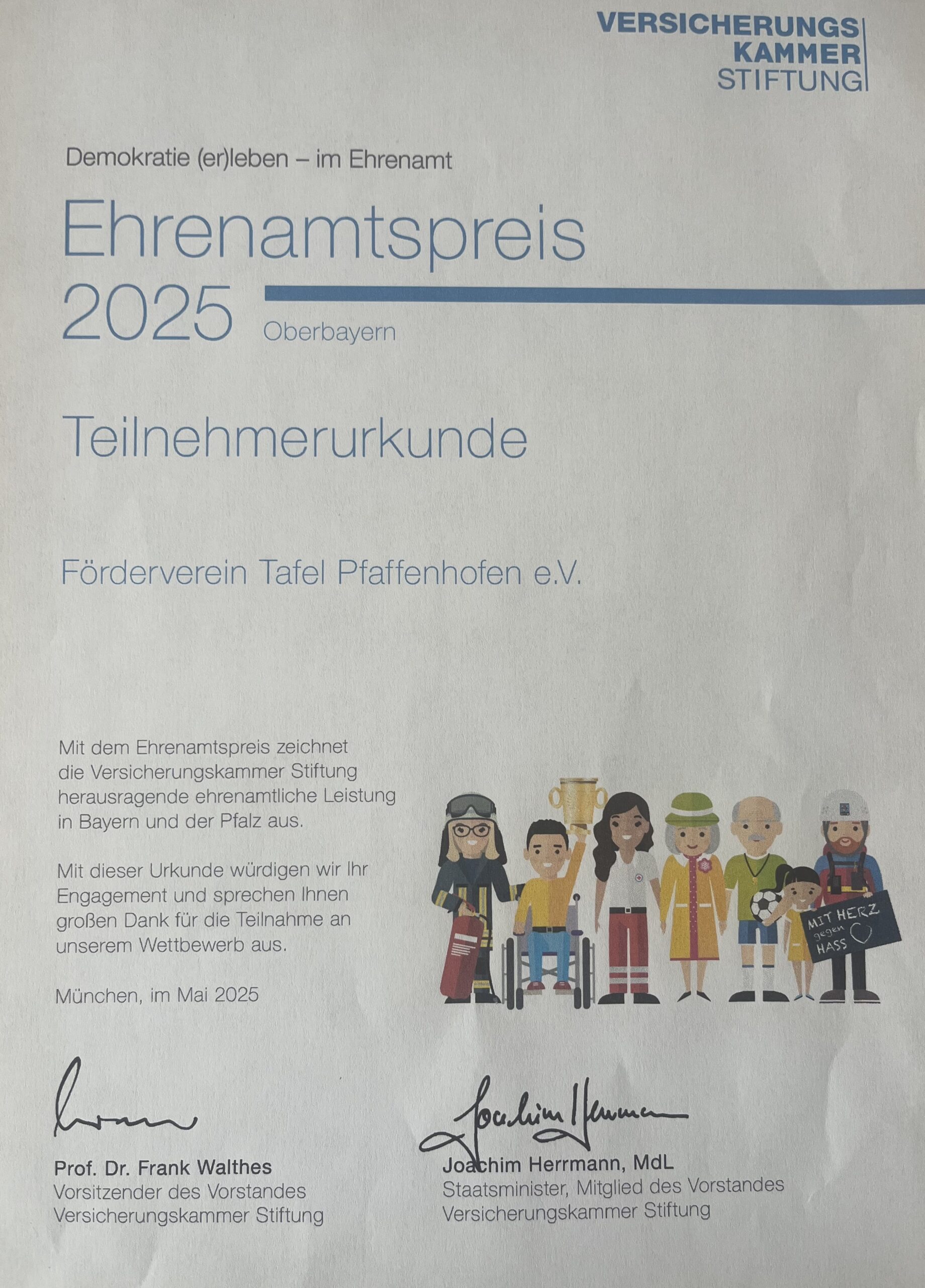 Der Förderverein Tafel Pfaffenhofen e.V. erhielt aus der Gesamtspende insgesamt 2.700 €.